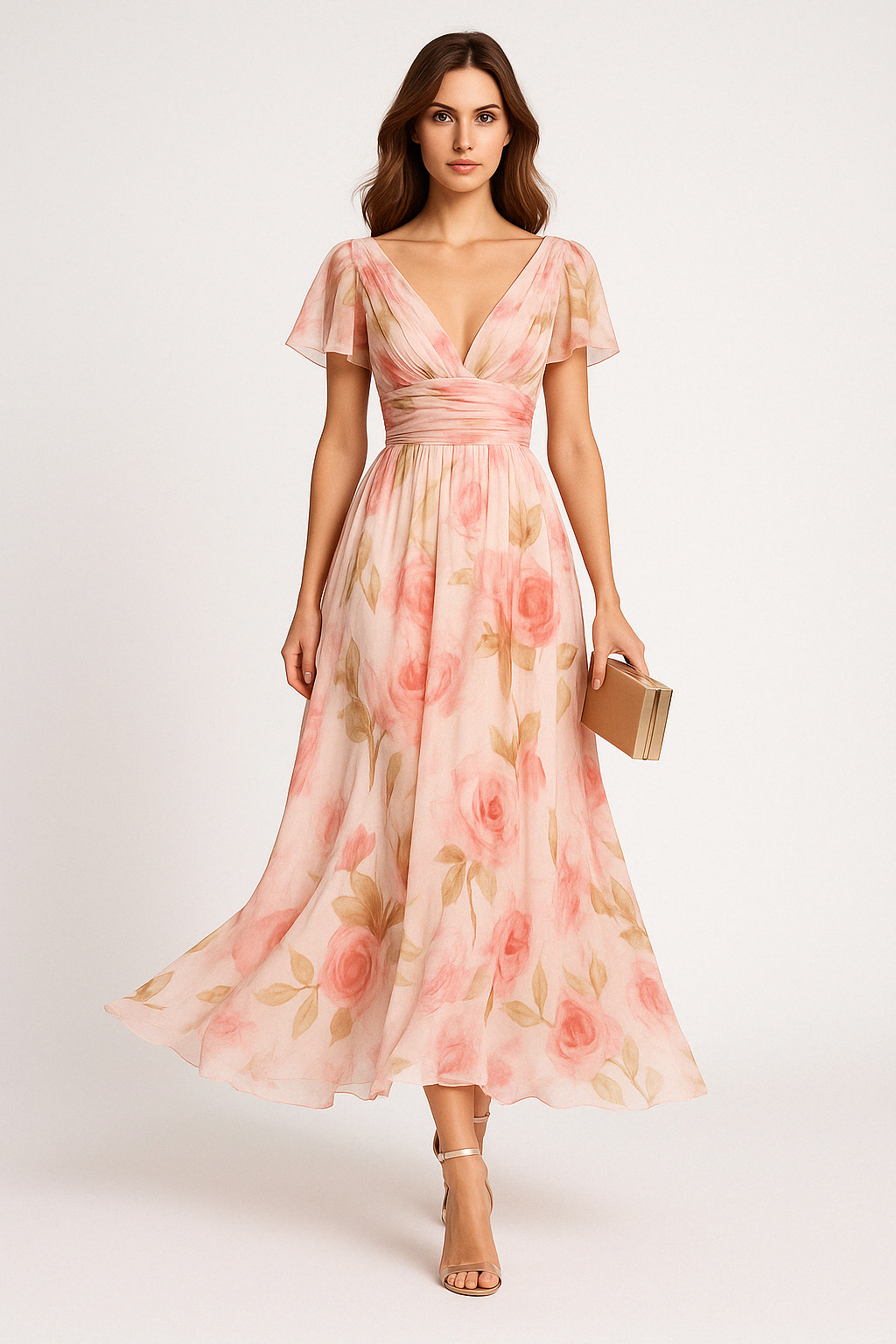 Ausgestelltes Geblümtes Hochzeitsgastkleid für Damen | V-Ausschnitt